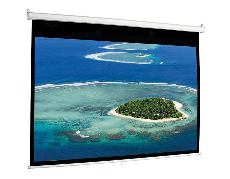 - Màn chiếu treo tường, kéo tay: Loại này tương tự như màn chiếu điện nhưng không có motor điện, thay vào đó bạn phải kéo màn xuống bằng tay và vải màn sẽ được cuốn lên nhờ một lò so nằm bên trong trục cuốn. Màn chiếu cũng được sử dụng rộng rãi trong trình chiếu trường học, trình chiếu hội họp..